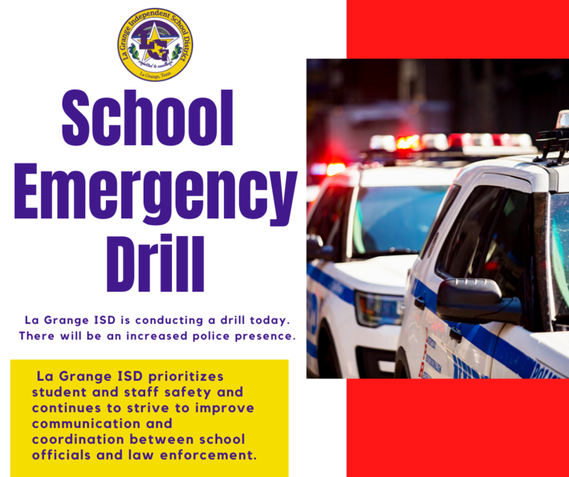 There will be an increased police presence on all La Grange ISD campuses on Tuesday, September 26, 2023 as part of scheduled Emergency Drills will law enforcement.